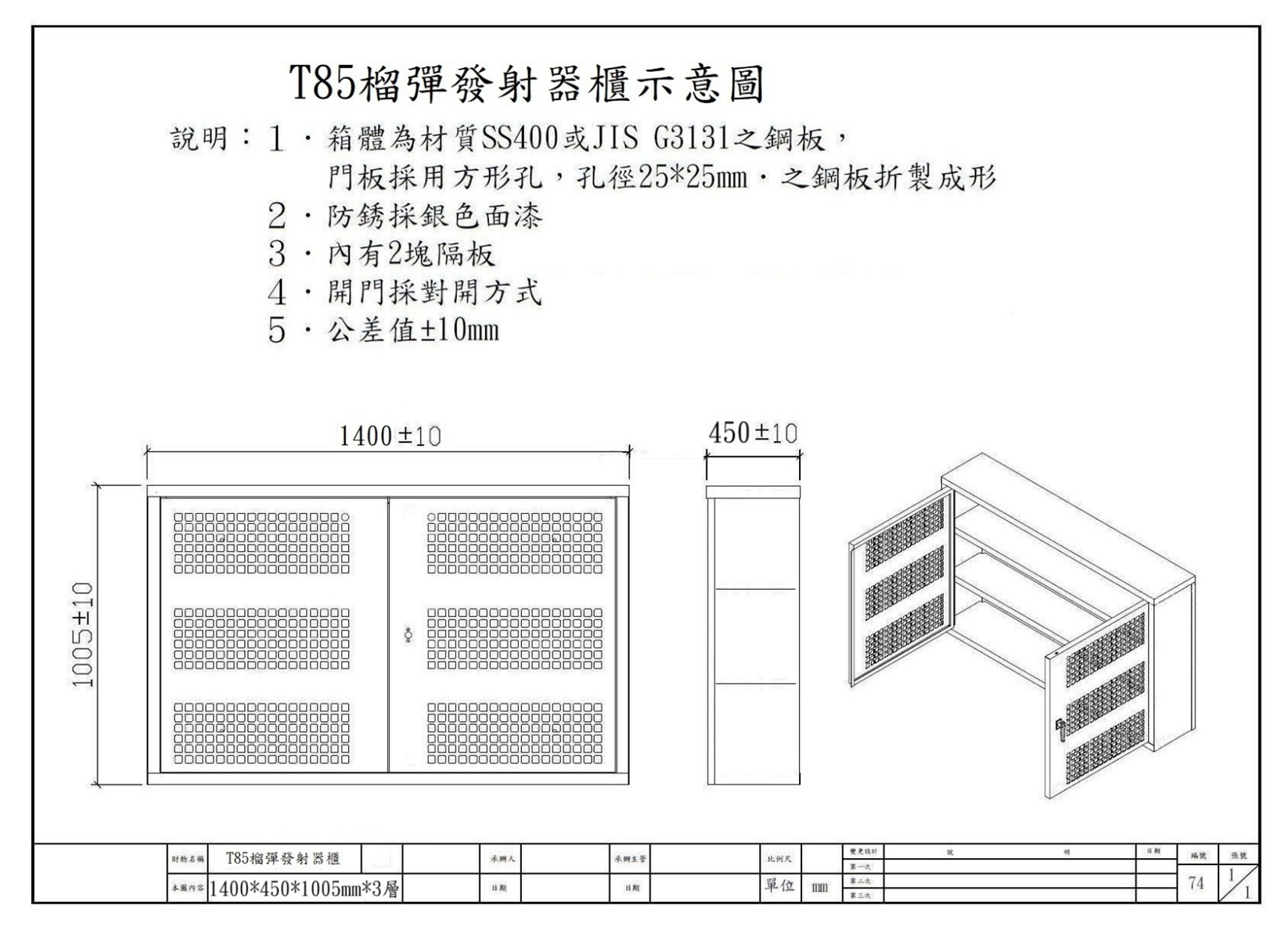 T85 榴彈發射器櫃 適用於 T85 榴彈發射器收納管理,箱體結構穩固,可依需求進行尺寸客製。 產品特色 箱體材質採 SS400 或 JIS G3131 鋼板。 門板為方形孔鋼板折製成形,兼顧通風與辨識。 內部設有 2 塊隔板,方便分類收納。 防銹銀色面漆,適合長期使用。 規格說明 開門方式:對開門 尺寸:W1400 × D450 × H1005mm 可依需求規格尺寸訂製 需要報價或客製尺寸? 歡迎來電或聯絡我們洽詢。 電話洽詢:04-892-2243